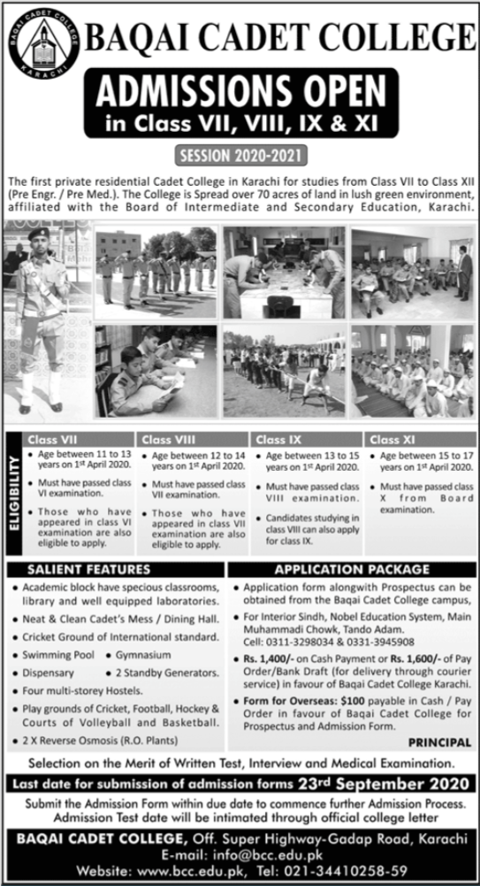 Baqai Cadet College is seeking applications for admissions 2020 in Class 7th, Class 8th, Class 9th, 1st year in Karachi. Last date for submission of admissions forms is 23rd September, 2020.