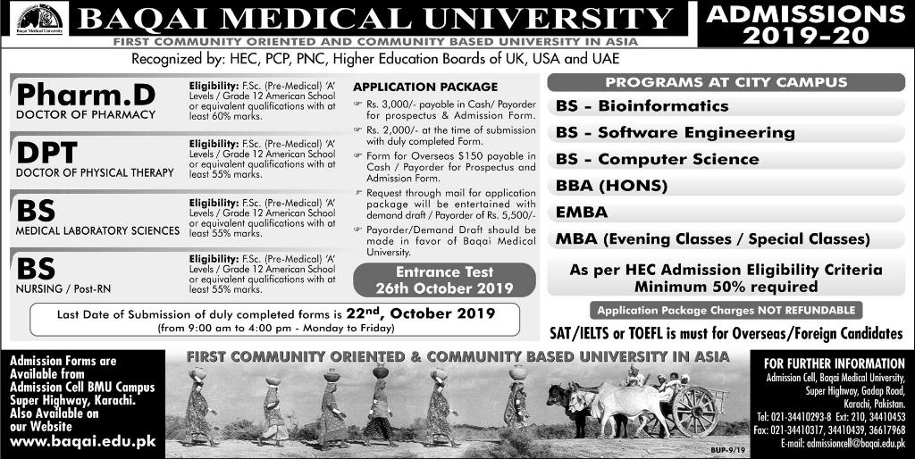 Baqai Medical University Karachi has announced admissions for BS in Nursing, Medical Lab Technology, Computer science, Software Engineering, Bioinformatics, DPT Doctor of Physical Therapy, Pharm-D. Last date for submission of admission application 22 Oct 2019.