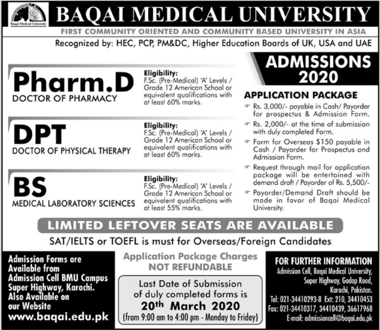 Baqai Medical University Karachi has been offering admissions for Pharm.D, DPT Doctor of Physical Therapy, BS in Medical Laboratory Sciences. Limited seats are available. Last date for submission of admission applications is 20 March 2020.