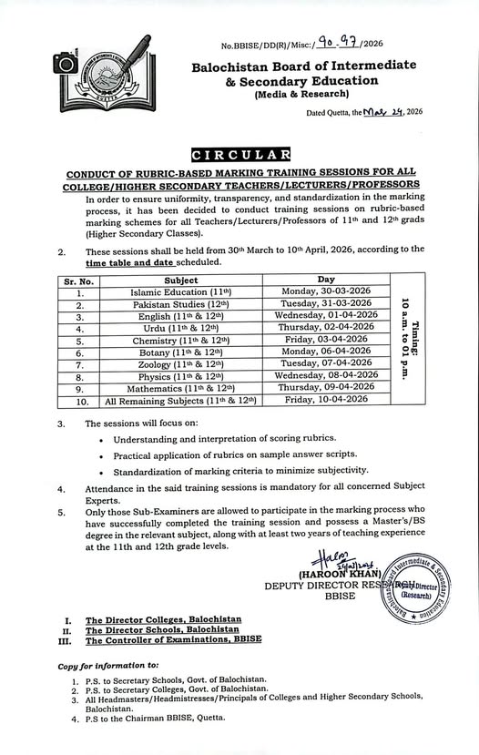 The BBISE Media & Research wing issued a circular on March 24, 2026, outlining a rigorous schedule for college and higher secondary teachers. The primary objective is to eliminate subjectivity in the marking process and provide a fair platform for all students across the province. By adopting a standardized scoring rubric, the board aims to align Balochistans results with international educational s.