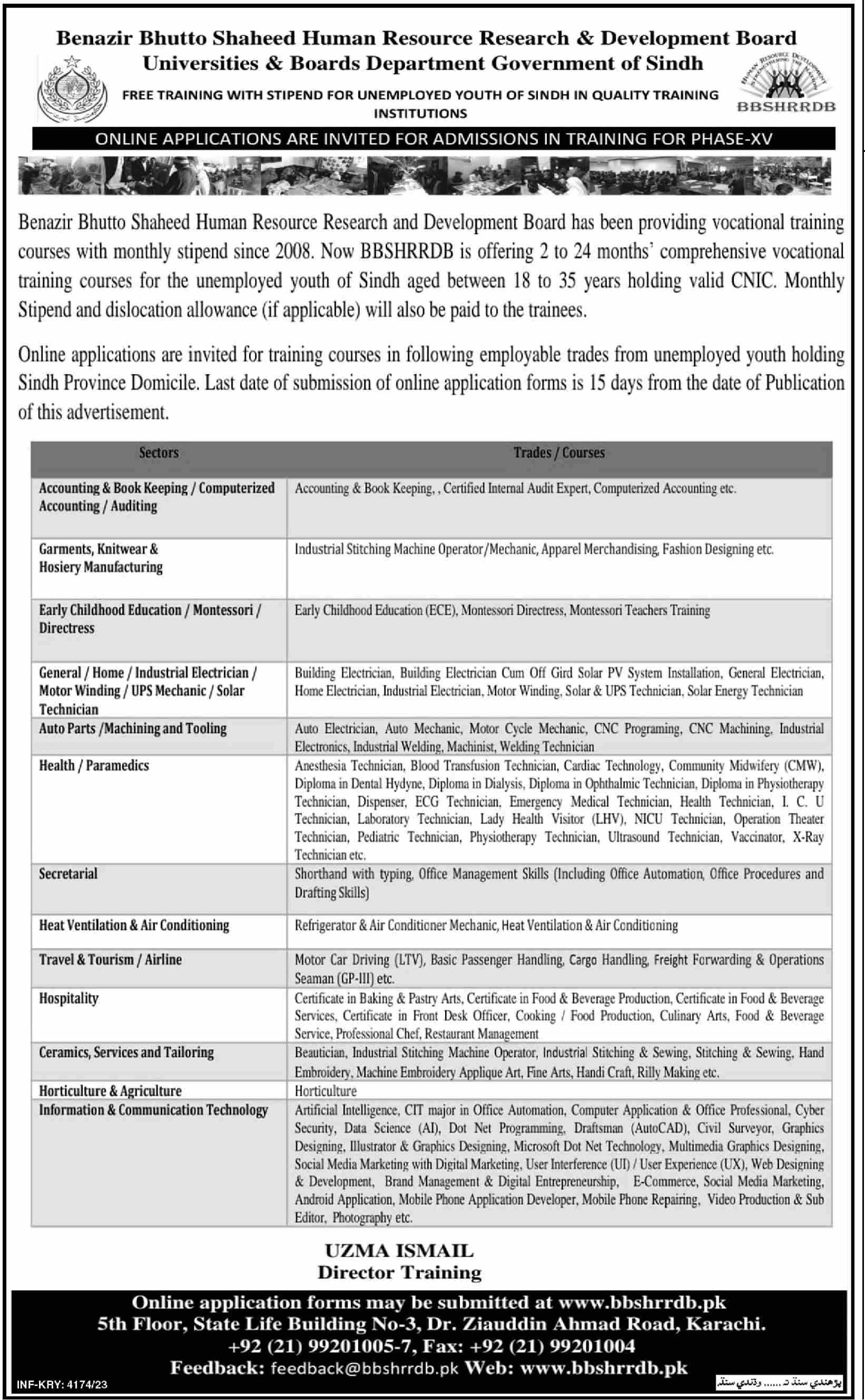 In a world where skills and education play a crucial role in securing a stable future, the Benazir Bhutto Shaheed Human Resource Research & Development Board BBSHRRDB is emerging as a beacon of hope for the unemployed youth of Sindh. Established in 2008, this initiative by the Universities & Boards Department of the Government of Sindh aims to provide vocational training and development opportunities to the young population of the province. The BBSHRRDB has been instrumental in offering comprehensive vocational training programs with monthly stipends, and now they are inviting applications for Phase-XV of their training courses.