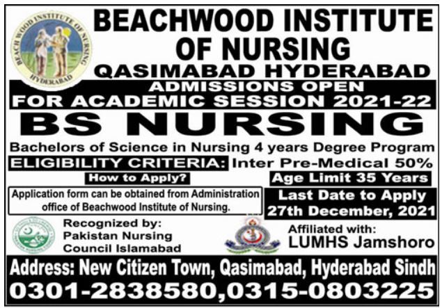 Beachwood Institute of Nursing Hyderabad is extended the deadline for Admissions and looking for Applications from Aspirants for Admissions to BS Nursing. Candidates having Intermediate FSc education with 50% marks are eligible to apply Admission. Candidates shall submit their applications now on or before December 27, 2021. BS Nursing Program is Affiliated with LUNHS Jamshoro and Recognized by Pakistan Nursing Council Islamabad. Admissions are ongoing for Academic Session 2021-2022.