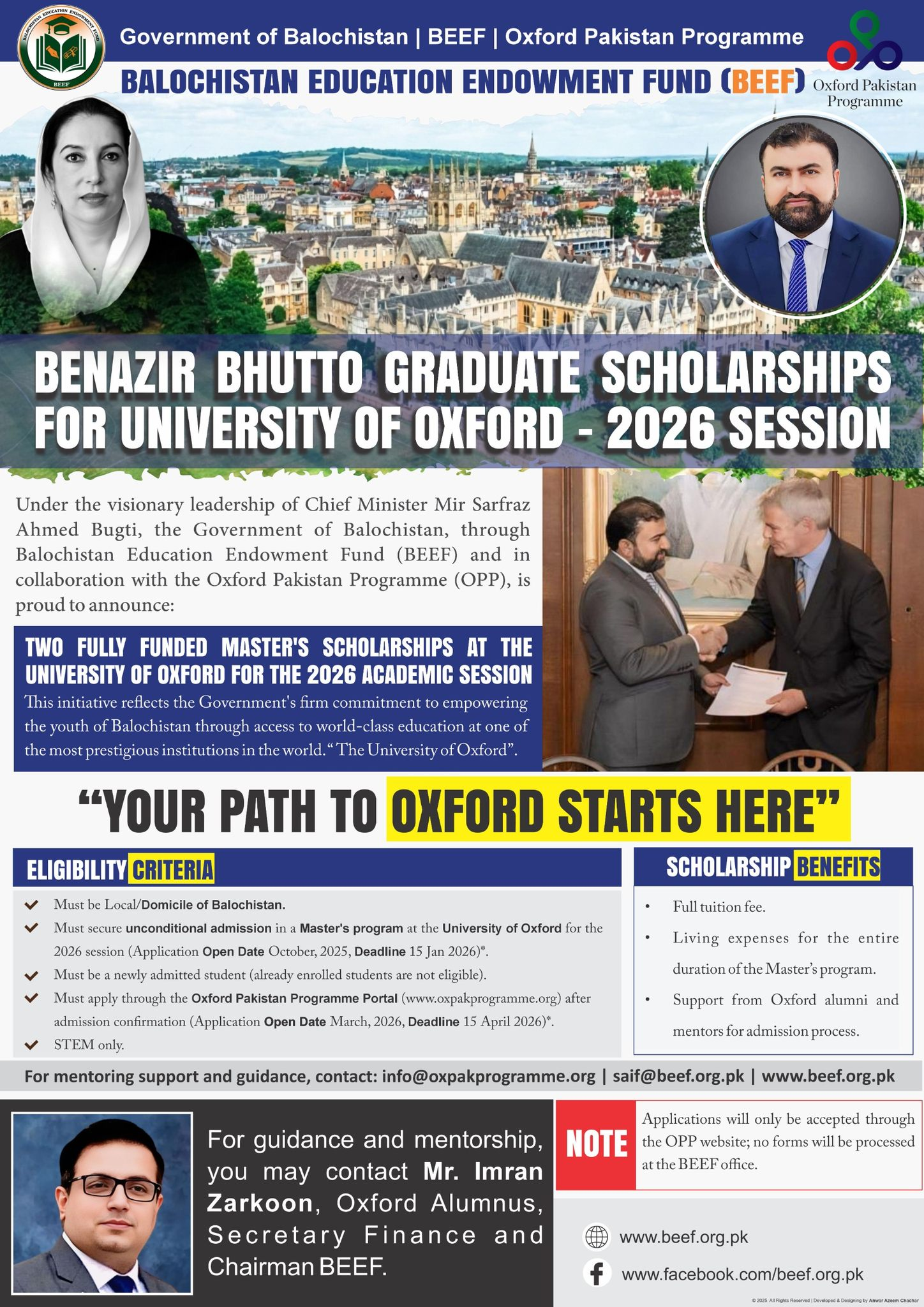 Baluchistan Education Endowment Fund has announced the Benazir Bhutto Graduate scholarships for the University of Oxford for the session 2026. The candidates, who want to pursue the higher education at the graduate degree level, they can apply for the award of this scholarship. The BEEF has announced two fully funded scholarships for the master degree level and the candidates can apply through Oxford Pakistan Program Portal as the application will be opened during March 2026 and the candidates can apply by the deadline of 15 April 2025. The students can get the latest updates of BEEF Benazir Bhutto Graduate Scholarships for Oxford University 2026.
