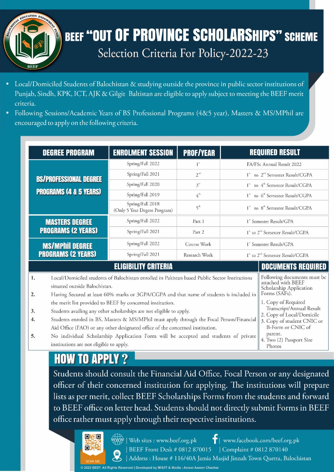 Baluchistan Education Endowment Fund BEEF based in Quetta has launched a promising scholarship initiative for students hailing from Baluchistan. This scholarship opportunity extends to students who are studying in both public and private universities and institutes outside of the Baluchistan province. These institutions can be located in various regions, including Punjab, KPK, Sindh, GB, AJK, and ICT. The scholarship program focuses on higher classes, encompassing BS Professional Programs spanning 4 to 5 years, as well as Masters and MS/MPhil programs.