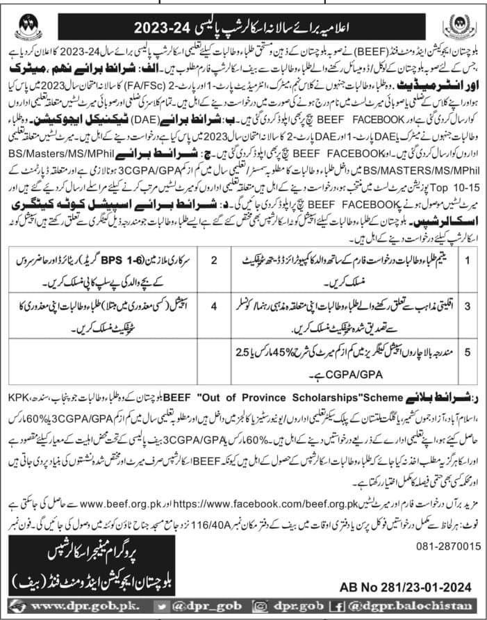 Balochistan Education Endowment Fund BEEF has recently unveiled a significant initiative by announcing 145,000 scholarships for students pursuing education from Matric to MS levels. These scholarships cover various educational stages, including Matric, DAE, Inter, BS, MBBS, MA, MSc, and MS classes. The candidates can get the latest updates of BEEF Scholarships 2024: Empowering Education Across 34 Districts.