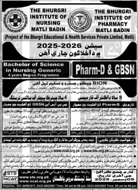The Bhurgri Institute of Nursing and The Bhurgri Institute of Pharmacy, Matli Badin, invite applications for admission 2025-2026 to their accredited degree programs. Both institutes are officially recognized and affiliated with: