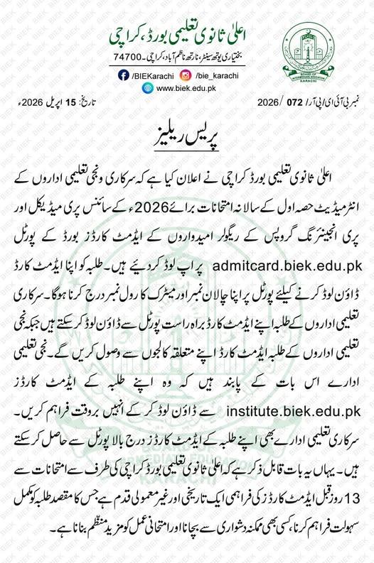 Board of Intermediate Education Karachi is making all necessary arrangements to conduct the intermediate class part 1 annual exams for the year 2026 on the scheduled dates and time. The education board has completed the process of checking of the admission forms and issued the date sheet and BIEK Karachi 11th Class Annual Exams 2026 Roll No Slips to the students. The regular students of the science Pre-Medical and Pre-Engineering groups can get their admit cards, which are uploaded on the official portal of the board. The students will have to enter their challan number and the roll no of the matric class to download their roll no slips.