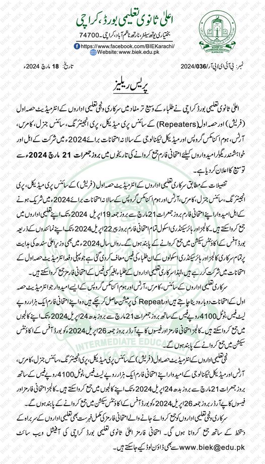 The Board of Intermediate Education Karachi BIEK, responsible for overseeing educational assessments in the region, has released a revised schedule for BIEK 11th Class Exams 2024. This update comes as a crucial piece of information for students preparing to embark on their academic journey at the BIEK 1st Year Exams 2024.
