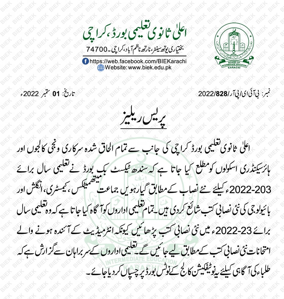 Karachi, Board of Intermediate Education Karachi has announced that Sindh Textbook Board has announced new syllabus of the subjects of Mathematics, Chemistry, English and Biology of intermediate part 1 for the academic session 2022-23. The candidates can follow their BIEK 11th Class New Syllabus 2022-23 and all of the public and private colleges and higher secondary schools affiliated with Karachi Inter Board impart the education to their students according to this new schedule as the new coming papers will be conducted according to this course.