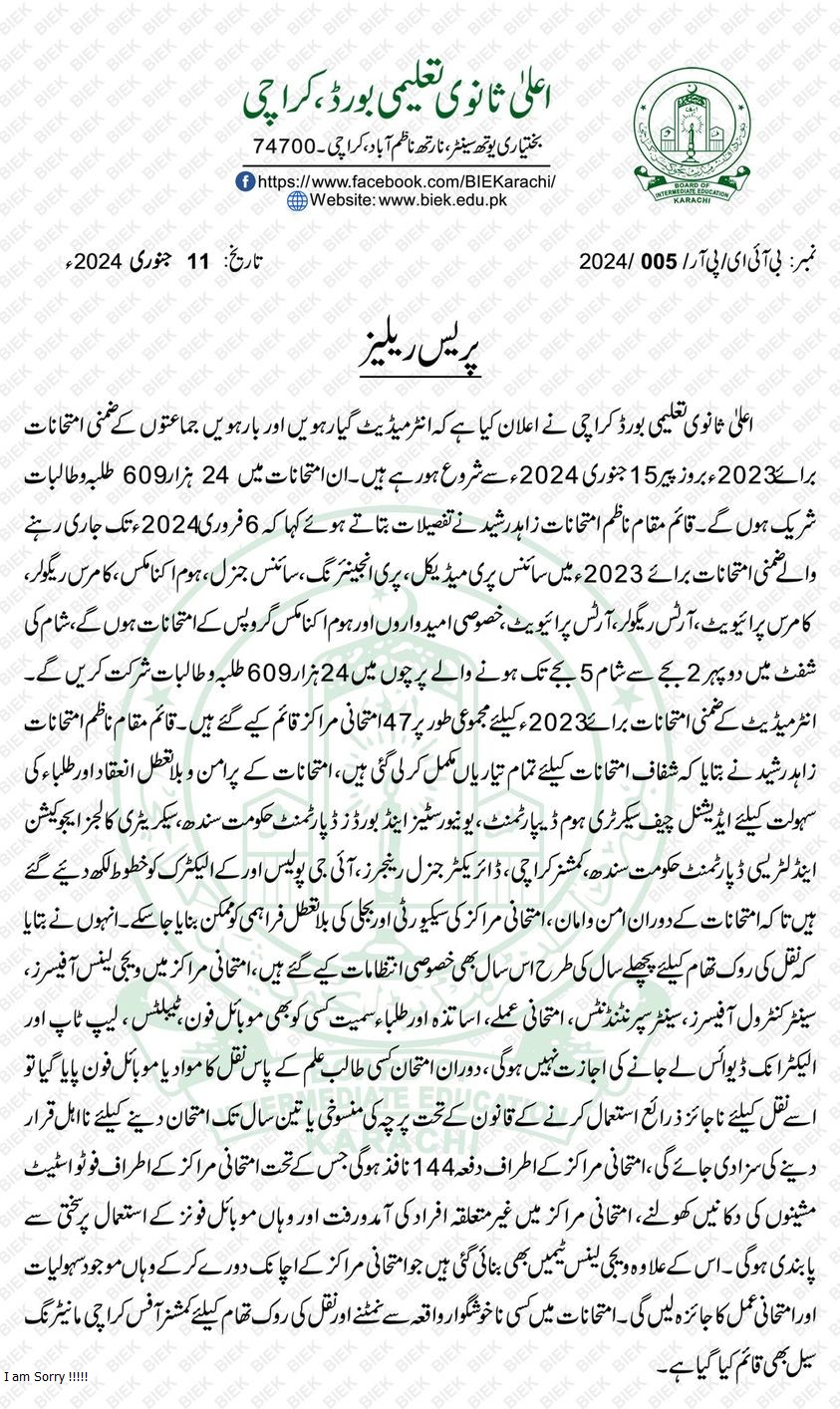 Karachi, Board of Intermediate Education Karachi will begin their BIEK Inter supply exams 2023 from 15-01-2024. The exams department has already collected the admission forms from students and after their documentation, the BIEK board has issued their date sheet and roll no slips enabling them to appear in their BIEK 11th class supply exams 2023 and BIEK 12th class supply exams 2023. The education board has announced that the students will that their BIEK HSSC Supply Exams 2023 Starts Date.