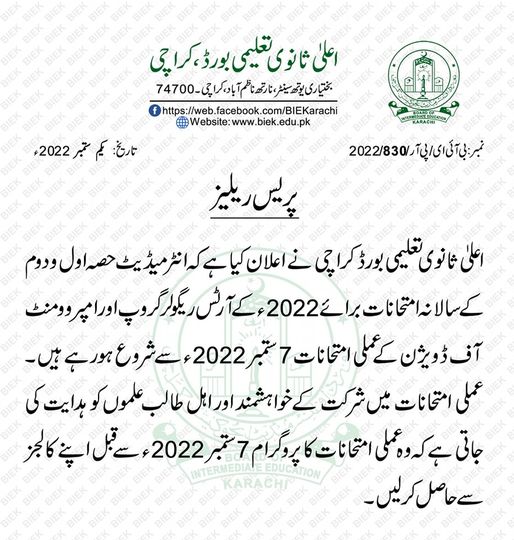 Karachi, Board of Intermediate Education Karachi has already conducted their BIEK Karachi 12th class annual exams 2022 for Arts regular group and improvement of division. Now the exams section of BIEK has announced to start their practical exams according to their BIEK Inter Annual Exams 2022 Practical Schedule from 07-09-2022. The candidates will collect their practical exams schedule from their colleges before the start of their practical exams.