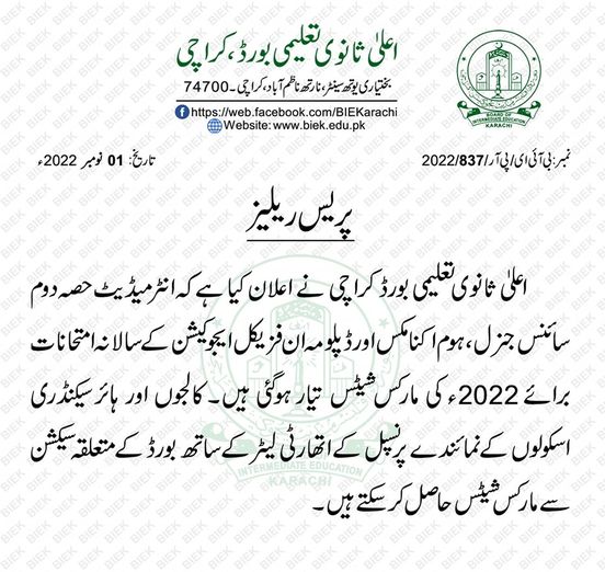 Karachi, Board of Intermediate Education Karachi conducted their BIEK Karachi HSSC part 2 annual exams 2022 in General Science, Home Economics and Diploma in Physical Education. The exams section of Karachi Inter Board announced their BIEK 12th class annual exams result 2022. After the declaration of the intermediate part 2 annual exams result, BIEK announced to prepare the marks sheets of the students and now BIEK Inter Annual Exams 2022 Result Marks Sheets are available right now. The candidates and the reps of the colleges and higher secondary schools obtain the marks sheets of the passing candidates from the relevant section with the authority letter of the principal.