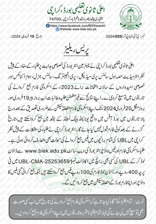 Karachi, Board of Intermediate Education Karachi has already announced their BIEK Karachi HSSC annual exams result 2023. The exams section of Karachi Inter Board has announced the scrutiny forms submission schedule for the students, who are not satisfied with their result and they want to recheck or re-total their obtained marks in their answer sheets. In order to facilitate the students, the education board has accorded the extension in the last date for submission of the scrutiny forms. The candidates can follow the BIEK Inter Annual Exams 2023 Scrutiny Forms Schedule Extended.