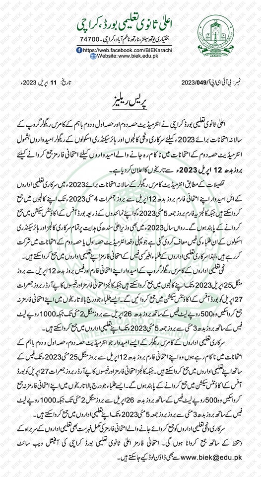 Karachi, Board of Intermediate Education Karachi will start their BIEK Karachi HSSC Commerce annual exams 2023. The students of the regular group of commerce will send their application forms according to the BIEK Inter Commerce Annual Exams 2023 Forms Schedule. The candidates of BIEK Karachi will submit their application forms from 12-04-2023 to 04-05-2023. The students of the public sector colleges and higher secondary schools, who are going to appear in the intermediate part 1 or 2 for the first time, their admission fees have been waived off. The regular students of the private colleges will submit their application forms with regular fee from 12-04-2023 to 25-04-2023. The late college students will also forward their application forms with late fee payment of Rs.500/- from 26-04-2023 to 02-05-2023 for their BIEK 1st year annual exams 2023 and BIEK Karachi 2nd year annual exams 2023. The candidates will also avail the final chance of sending their admission forms with the payment of late fee of Rs.1000/- from 03-05-2023 to 05-05-2023.