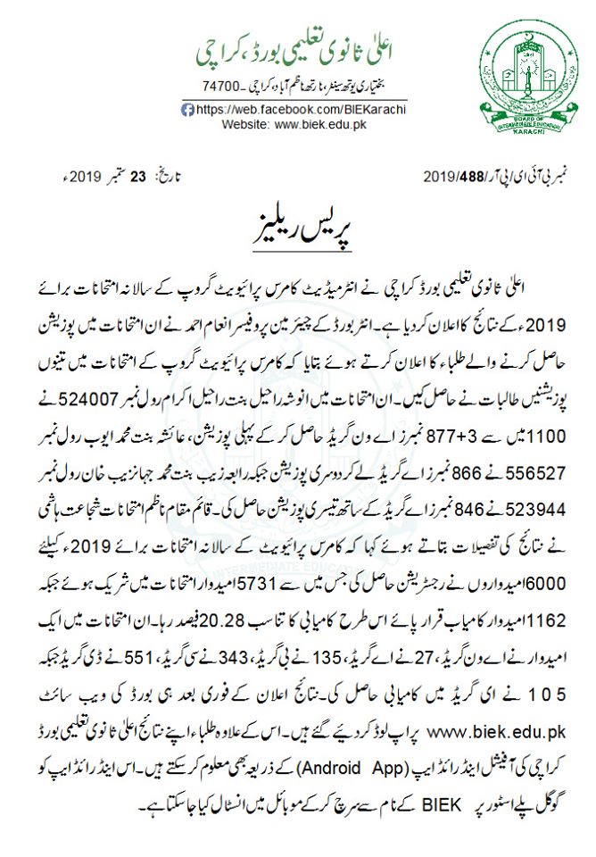 Karachi, Board of Intermediate Education Karachi has already conducted the BIEK HSSC commerce private annual exams 2019 few months earlier. The exams department has taken few months for the announcement of their BIEK Inter Commerce Private Result 2019. According to the BIEK FA/FSc Commerce Result 2019, total 6000 students got registered with inter board Karachi and 5731 students attended their BIEK Karachi 12th class commerce annual exams 2019, out of which total 1162 students were declared successful. BIEK FA/FSc Commerce result 2019 is uploaded on the website soon after announcement of the result and the students can watch the complete detail of the result. The candidates can also search their results on the official Android App of BIEK and the candidates look the app from Google play store and download on their mobile phone.