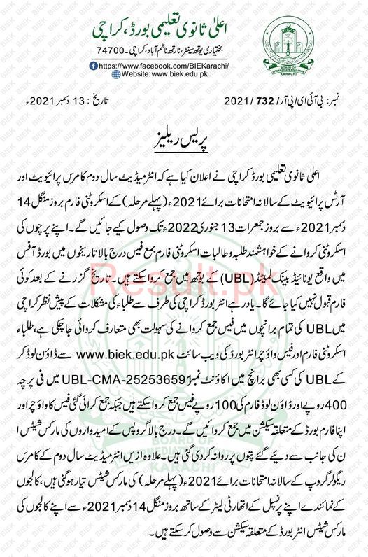 Karachi, Board of Intermediate Education Karachi has already announced their BIEK Karachi HSSC Part 2 annual exams 2021. The students, who want to scrutinize their papers, they can submit their scrutiny forms from 14-12-2021 to 13-01-2022 in the booth of UBL in board office. The students will deposit the fee of Rs.400/- per paper and the fee of download forms of Rs.100/- in any branch of UBL as the facility of fee deposit is introduced in all branches of UBL, which are located in Karachi and they will submit the fee voucher of the deposited fee in the relevant section of the board. The candidates will follow BIEK Inter Part 2 Annual Exams Result 2021 Scrutiny Forms Schedule and they will send the admission forms and payment of fee in the relevant branch.