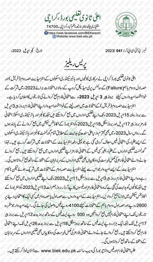 Karachi, Board of Intermediate Education Karachi has announced the start of their BIEK Karachi HSSC Pre-Medical Annual Exams 2023. The exams section of Karachi Inter Board makes necessary arrangements for the 11th and 12th class fresh candidates of part 1 and 2 and composite failure students of the science Pre-Medical group for the coming annual exams 2023. The candidates can note their BIEK Karachi Inter Pre-Medical Annual Exams 2023 Forms Schedule and regular students can submit their application forms from 03-04-2023 to the 15-04-2023 in their respective colleges and these colleges and higher secondary schools will submit the application forms of their students on 17 and 18 April 2023 in the board office. The admission fee of the fresh students of the government colleges has been waived off. The failed students will submit their application forms in their colleges from 03-04-2023 to 11-04-2023 and their colleges will deposit the pay order of their fees with their application forms in the account section of the inter board for BIEK Karachi 9th class annual exams 2023 and BIEK Karachi 10th class annual exams 2023. The students, who will appear in part 1 or part 2, they will deposit the fee of Rs.2600/- and for the composite exams, the students will deposit the fee of Rs.4100/-. The students will deposit the late fee of Rs.500/- to submit their application forms from 12-04-2023 to 17-04-2023. The late candidates will also forward their application forms with late fee of Rs.1000/- from 18-04-2023 to 26-04-2023. The admission forms can be downloaded from the official website of the board.