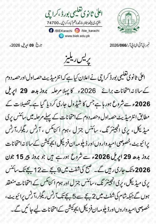 The BIEK Karachi Intermediate Exam Date Sheet 2026 was officially announced by the Board of Intermediate Education Karachi on April 9, 2026. According to the board’s press release, the annual examinations for both Part I and Part II will commence on Wednesday, April 29, 2026. This comprehensive schedule covers Science Pre-Medical, Pre-Engineering, and General, Home Economics, Arts Regular and Private, and Diploma in Physical Education candidates across Karachi.