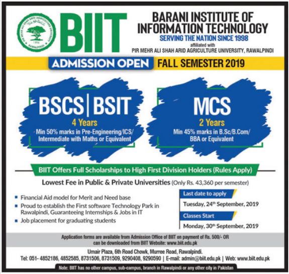 Barani Institute of Information Technology Rawalpindi has offered admissions for BS in Computer Science, Information Technology, MCS. Scholarships are available. Last date for submission of admission application 24 Sep 2019.