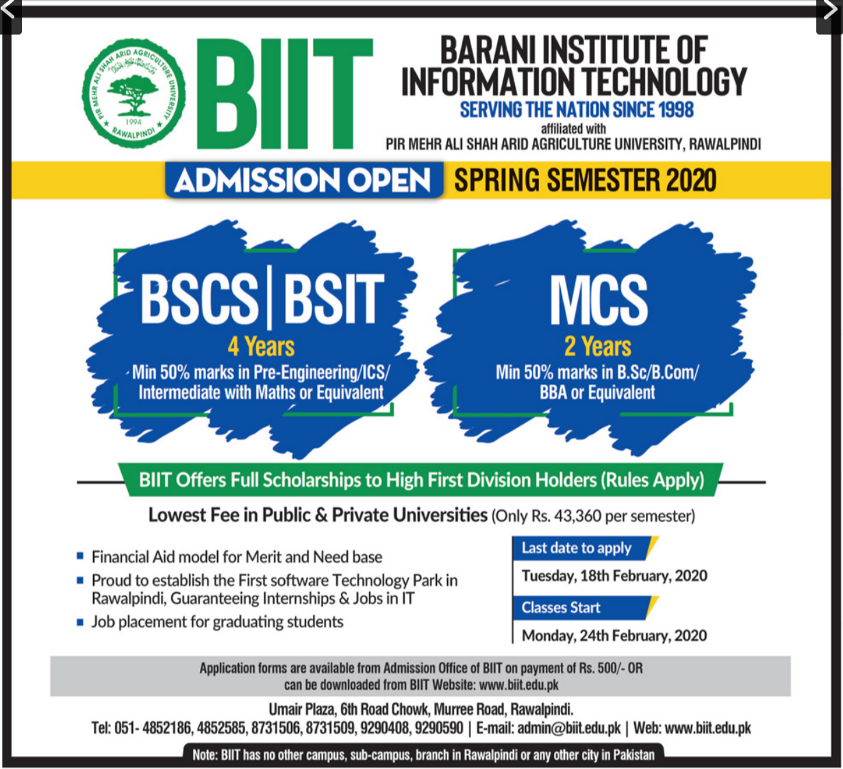 for the session of 2020. The Barani Institute of Information Technology Rawalpindi has now starts the Admission