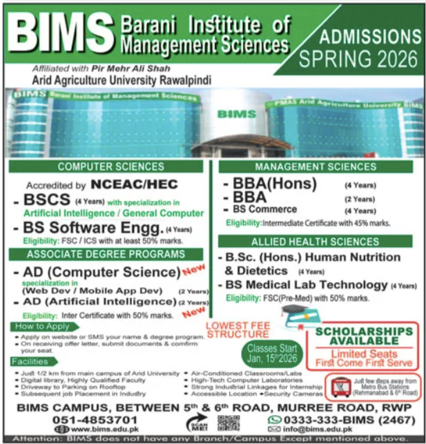 The Barani Institute of Management Sciences BIMS invites applications for its Spring 2026 intake across a wide range of programs in Computer Sciences, Management Sciences, and Allied Health Sciences. BIMS is dedicated to providing quality education with strong industry linkages, highly qualified faculty, and modern facilities.