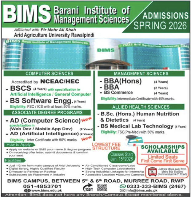 Barani Institute of Management Sciences BIMS, affiliated with Pir Mehr Ali Shah Arid Agriculture University, Rawalpindi, is now accepting applications for Spring 2026. With state-of-the-art facilities, highly qualified faculty, and strong industry linkages, BIMS offers students a comprehensive academic environment to excel in management, computer sciences, and allied health fields.