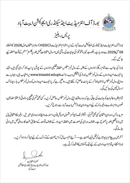 BISE Abbottabad HSSC Roll Number Slips 2026 Download and Distribution