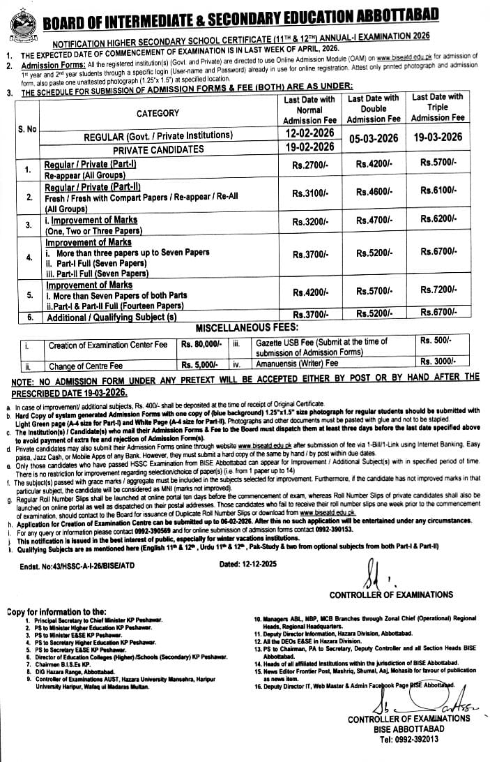 Abbottabad, Board of Intermediate and Secondary Education Abbottabad will conduct their intermediate class part 1 and 2 first annual exams for the year 2026 for the regular and private students. The students will follow the BISE Abbottabad Inter 1st Annual Exams 2026 Forms Schedule and they will send their admission forms and deposit the fee in accordance with this schedule.