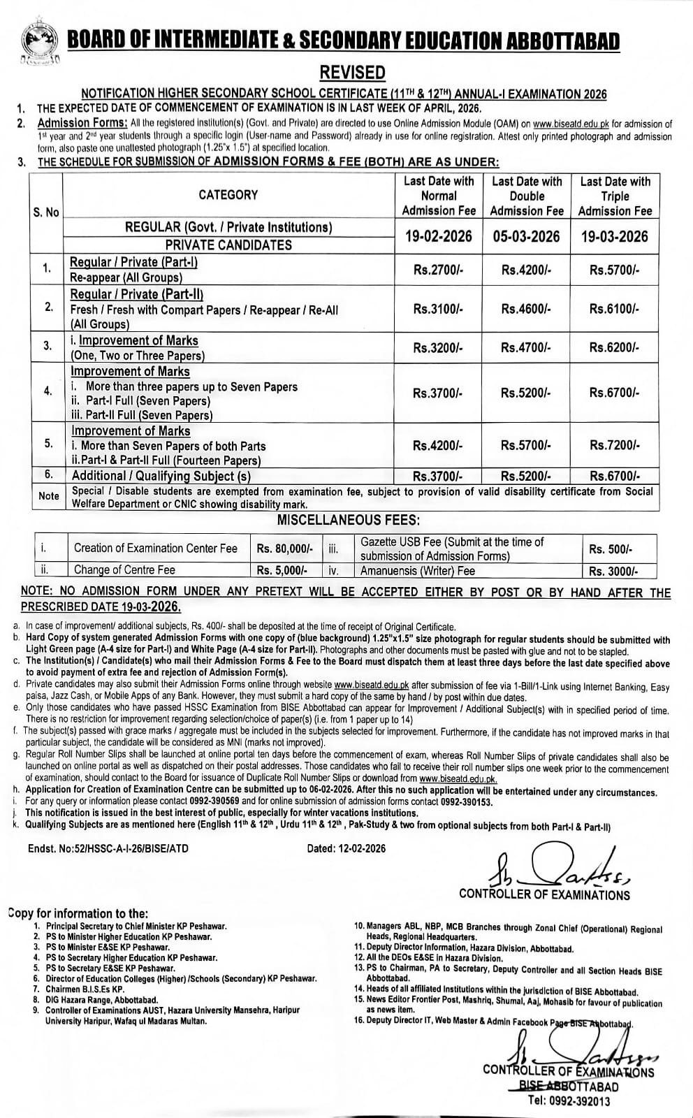 BISE Abbottabad Inter 1st Annual Exams 2026 Revised Schedule