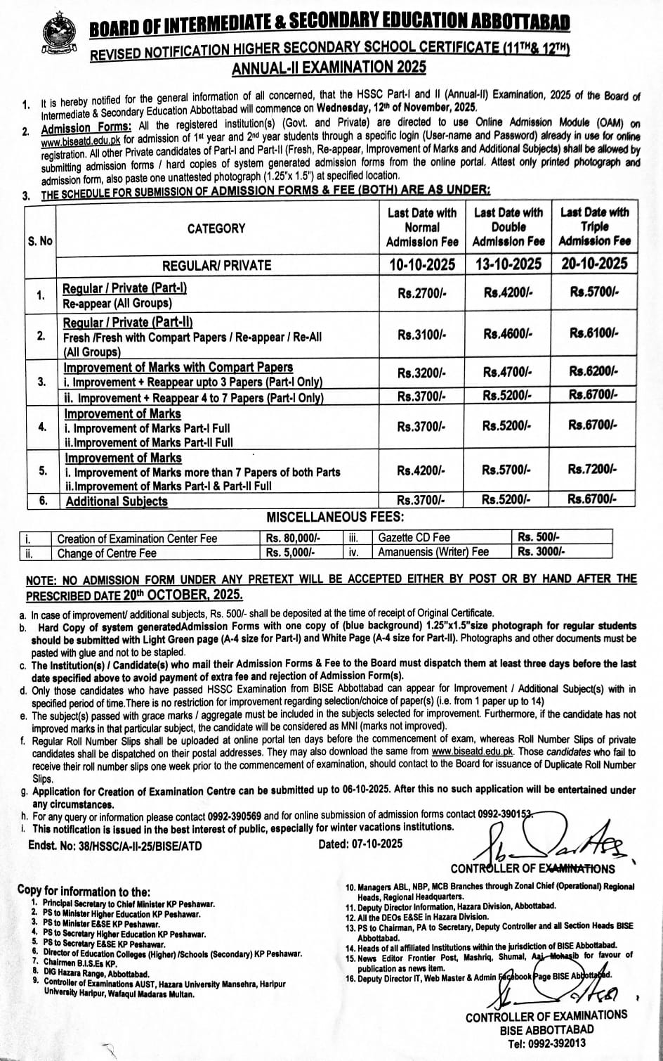 BISE Abbottabad Inter 2nd Annual Exams 2025 Forms Schedule