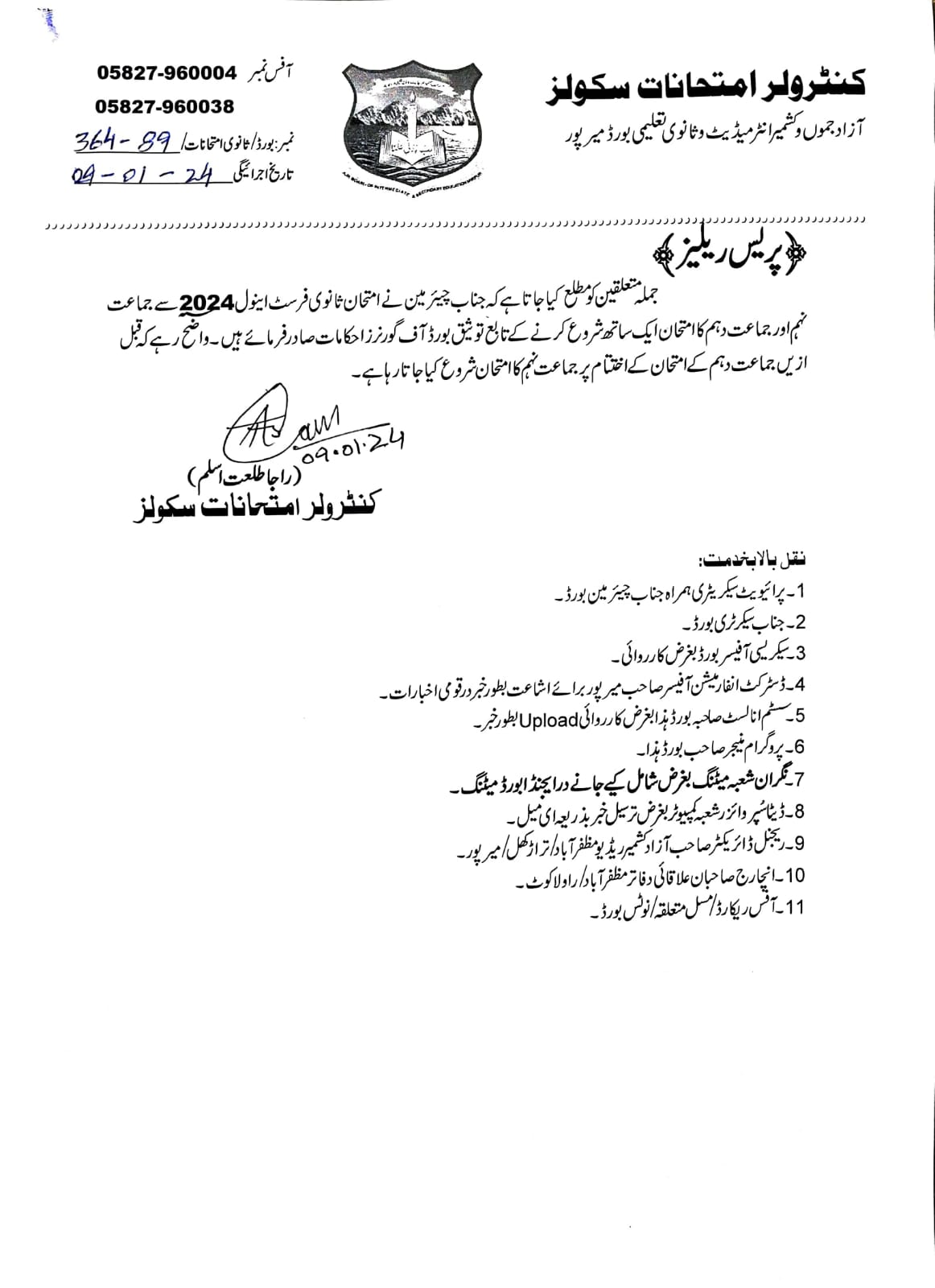 Mirpur, Board of intermediate and Secondary Education Mirpur AJK has announced that this education board conducted the 9th and 10th classes annual exams on different dates. AJK Board managed the matric class part 2 exams first and soon after finishing of the class 10 annual exams, the board managed the matric class part 1 exams. Now AJK Board has announced BISE AJK Matric 1st Annual Exams 2024 Starting Date.