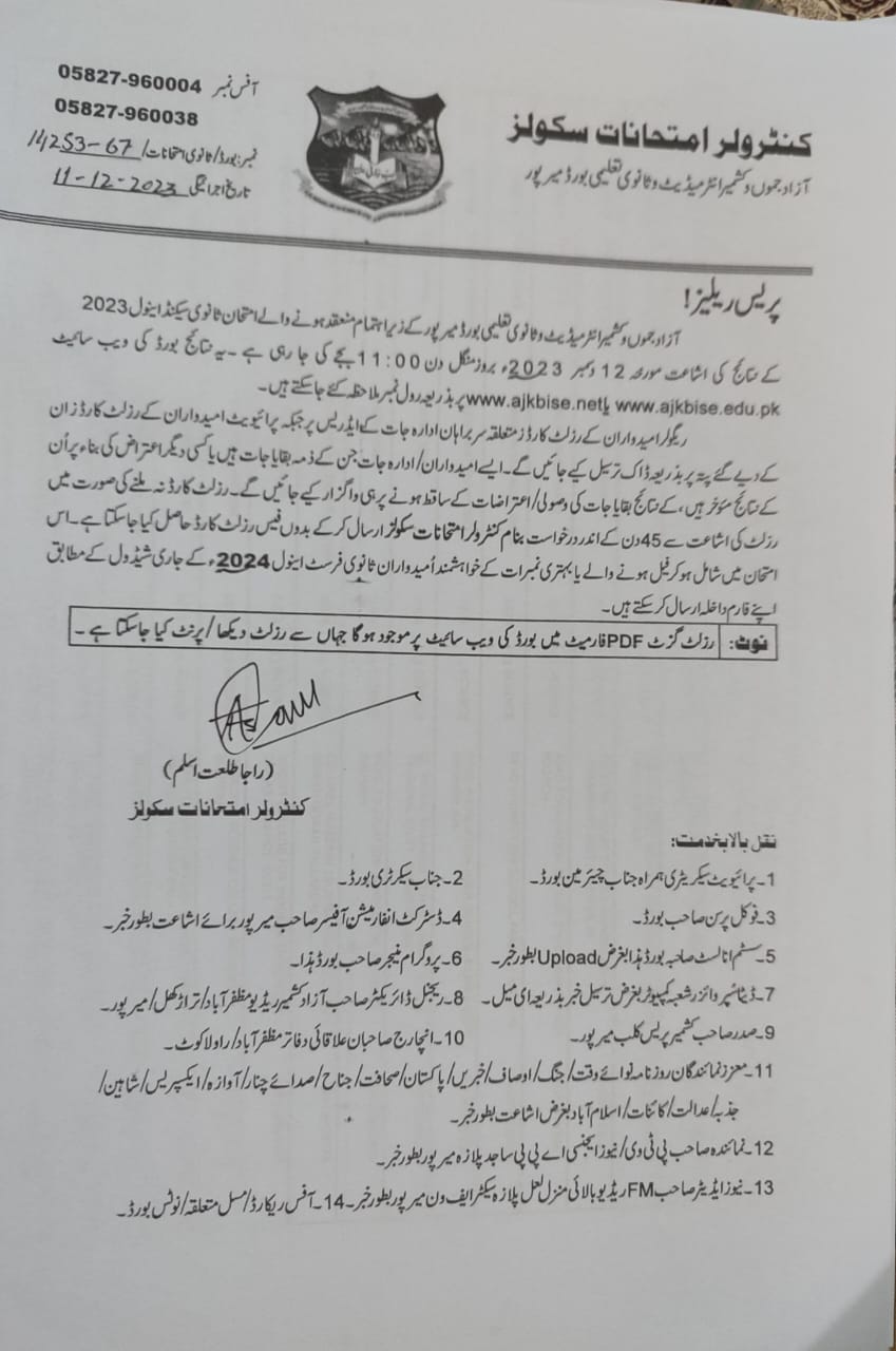 The education board Mirpur has made it clear that the result cards of the regular students will be sent to their respective schools and the private students will get their result cards on their home address. The candidates, who have some objection or have some amount pending against them, they need to pay it and their result will be announced soon. The passing students will march to their higher class while the failing students will appear in their coming exams being held in 2024.