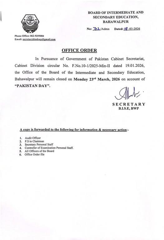 In a recent press release, the Board of Intermediate and Secondary Education Bahawalpur confirmed that its offices will be closed this coming Monday. The office order 2026 was released to formalize the break for Pakistan Day, a significant milestone in the countrys history. This public holiday announcement applies to all departments within the boards jurisdiction, ensuring staff can participate in national festivities.