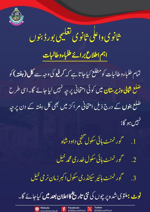 BISE Bannu Cancels Tomorrow Papers