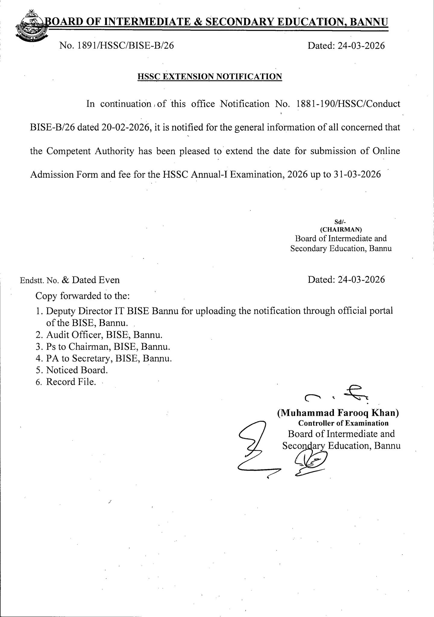 According to the latest update, the competent authority has approved an extension in the deadline for submitting online admission forms along with the required examination fee. Students and concerned candidates can now complete their submissions up to March 31, 2026.