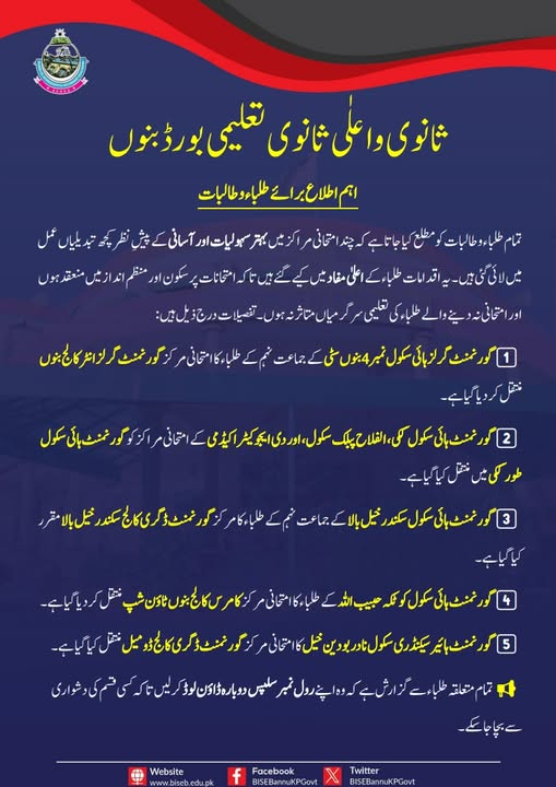 - The exams center of 9th class students of Govt Girls High School No.4 Bannu City has been changed to Govt Girls Inter College Bannu.