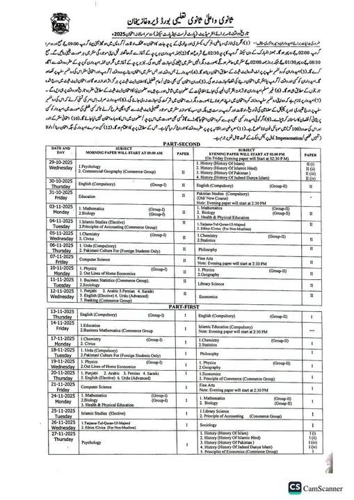 The students will note that their second year exams will be started from 29-10-2025 and the final papers will be conducted on 12-11-2025 while the first year exams will be managed from 13-11-2025 to 27-11-2025. The timings of the papers will be morning time from 09:00 am to 12:00 noon while the second shift papers will be conducted from 02:00 pm to 05:00 pm. The papers on Friday will be delayed up to half an hour.