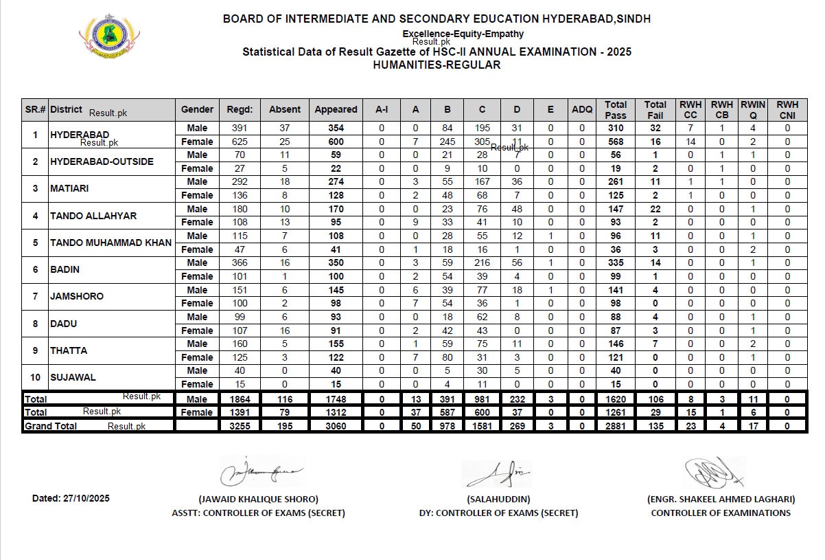 The BISE Hyderabad Inter Part II Humanities group results 2025 mark the completion of the HSC-II 2025 examination cycle for BISE Hyderabad. The board is expected to release the results for other groups — including Science General and Commerce — in the coming weeks.