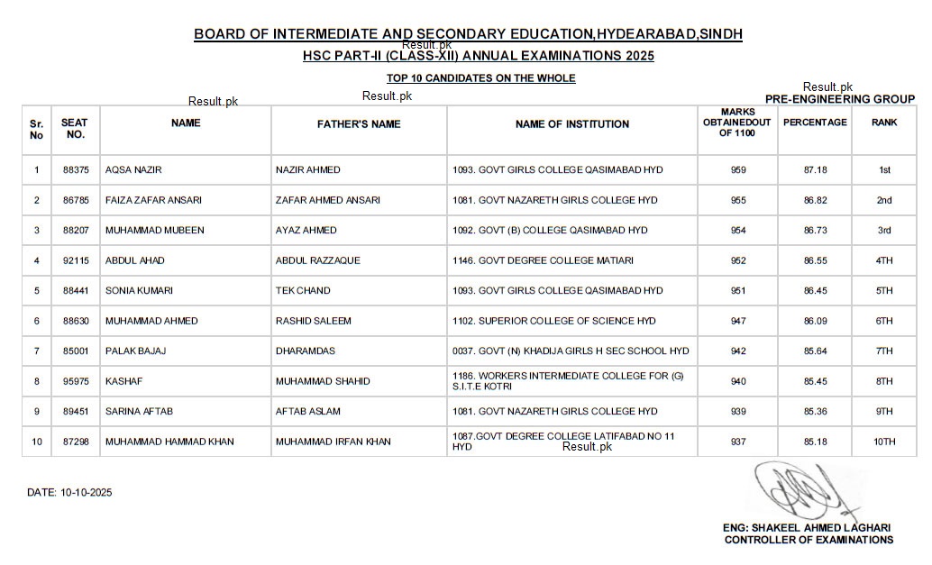 The board’s Controller of Examinations, Engr. Shakeel Ahmed Laghari, confirmed that students can check their results on the official BISE Hyderabad website. The announcement also highlighted the exceptional performance of students from government colleges across Hyderabad.