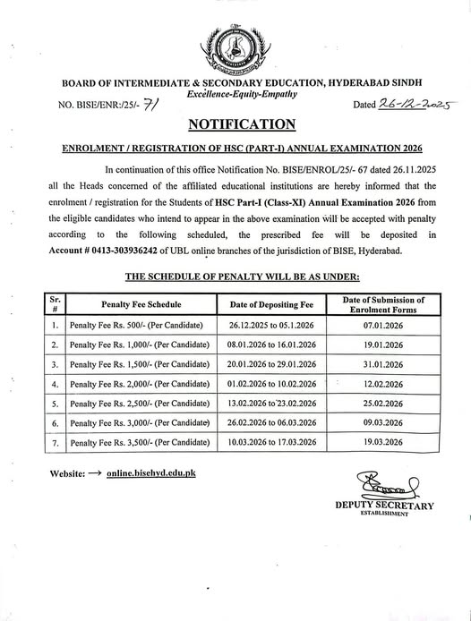 Board of Intermediate and Secondary Education Hyderabad has announced to accept the enrolment / registration forms and fee from the students of 11th class for the annual exams 2026. As the deadline of the single fee payment is expired but the board still accepts the admission forms from the students with the penalty according to this BISE Hyderabad HSC Part 1 Enrolment Exams 2026 Schedule.