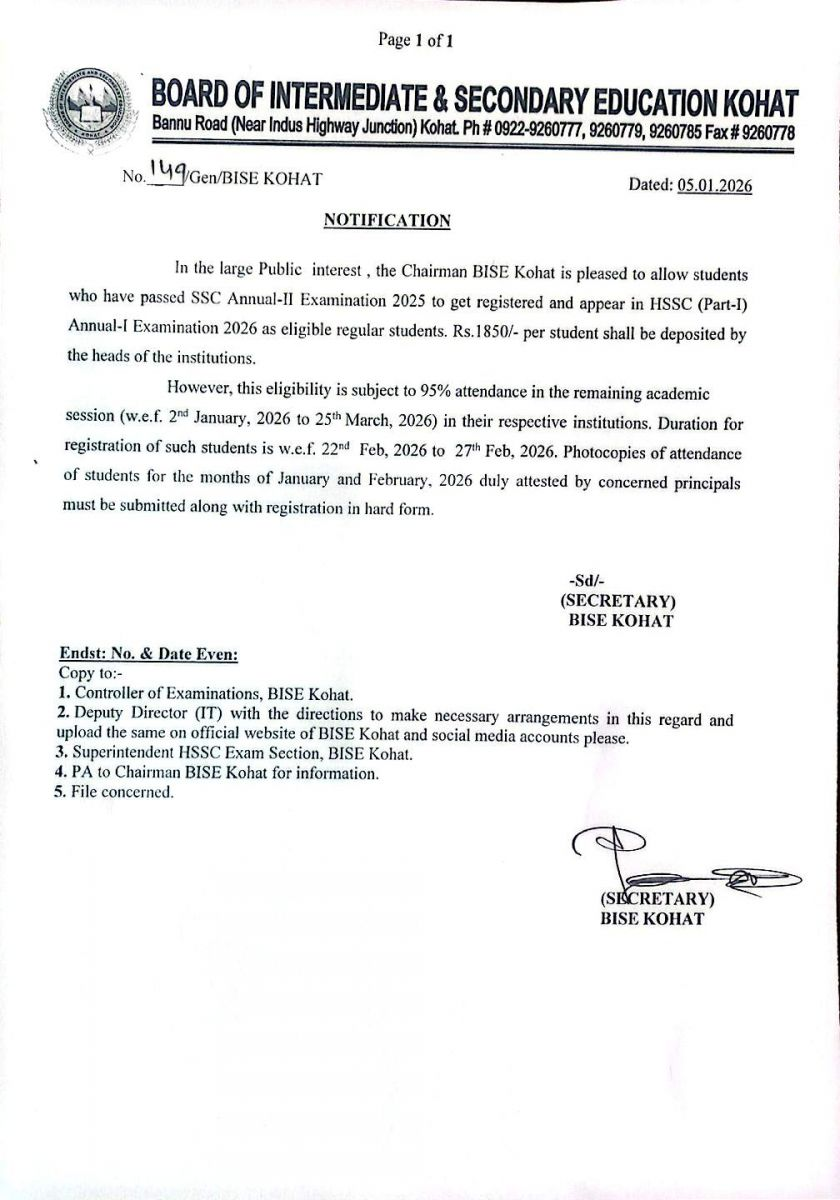 Board of Intermediate and Secondary Education Kohat has announced the registration schedule for the intermediate class part 1 for the students, who have passed their matriculation second annual exams 2025. The regular students will follow BISE Kohat 11th Class 1st Annual Exams 2026 Form Schedule and they will pay the registration fee of Rs.1850/- per student through their institutes.