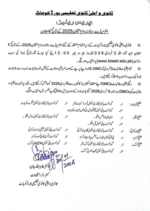 The education board has also made the announcement that the intermediate class part 1 and 2 result of the students of District Kurram will be made later.