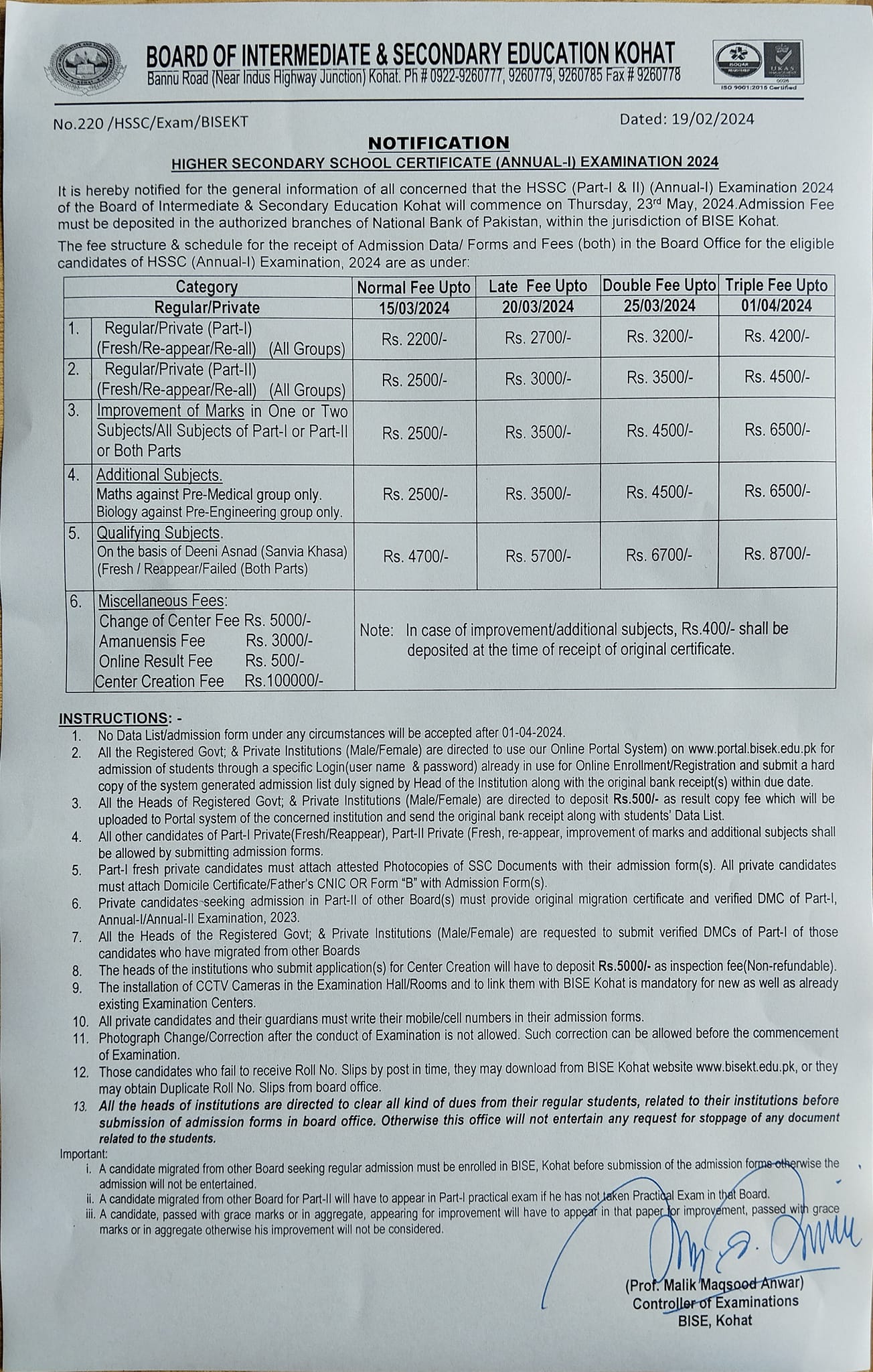 BISE Kohat HSSC 1st Annual Exams 2024 Forms Schedule