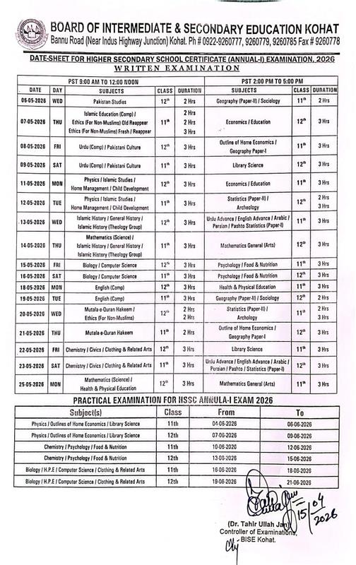 BISE Kohat HSSC Annual Exam Date Sheet 2026 Released