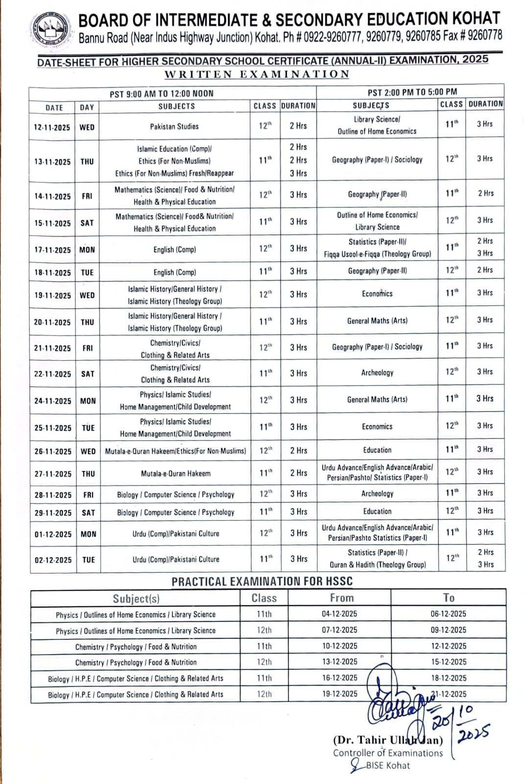 The students will note that soon after finishing of the written exams, the Kohat Board will start their practical exams of the science subjects from 04-12-2025 to 21-12-2025. The students will note their batch and they will attend the practical exams in their relevant batch.