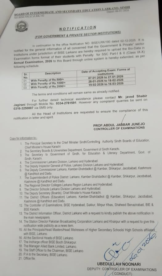The regular and private students of the affiliated schools of the Board of Intermediate and Secondary Education Larkana are advised to forward their application forms online and pay the fee to appear in the next coming matric class annual exams for the year 2026. The exams section of Larkana Board will follow the complete and comprehensive BISE Larkana Matric Annual Exams 2026 Forms Schedule for the submission of the online admission forms and fee.