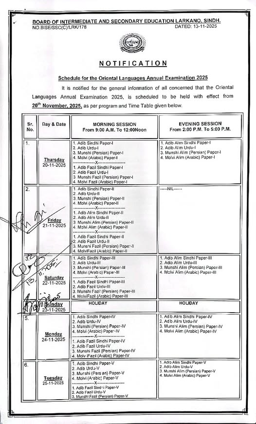 The Board of Intermediate and Secondary Education Larkana has officially released the Larkana Board date sheet for the Oriental Languages Annual Exams 2025. The exams are scheduled to begin from Thursday, November 20, 2025. Candidates are advised to check their roll number slips and follow the timetable carefully.