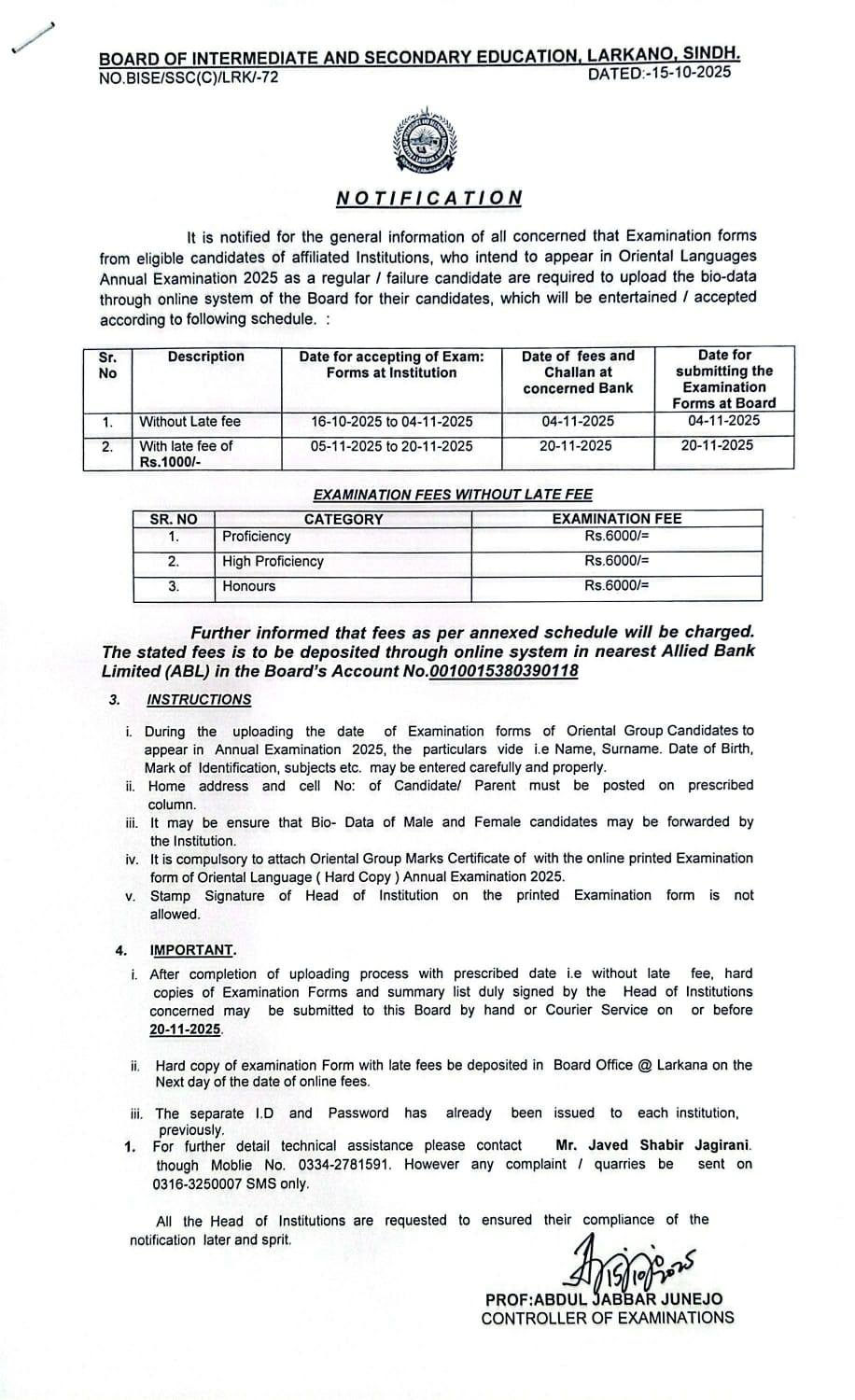 The Larkana Board instructed the students to fee the bio-data online with regular fee payment from 16-10-2025 to 04-11-2025. The candidates will complete the process of deposit of fee and submission of exams forms at board office by the final date. The candidates can also feed the bio-data online with late fee of Rs.1000/- from 05-11-2025 to 20-11-2025 and the will complete the process of payment of fee and submission of the forms of the students by the final date of 20-11-2025.