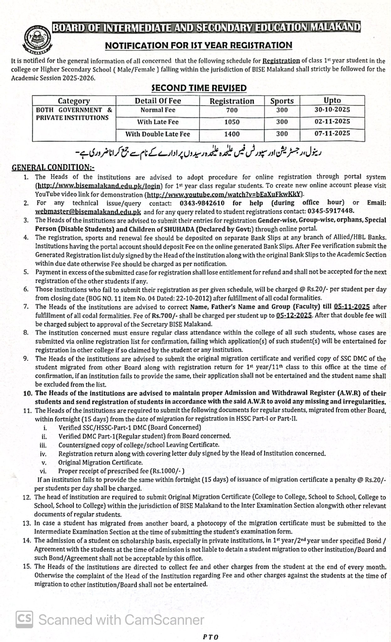 The regular and private institutes will submit the registration forms of their enrolled students with the normal fee payment by the final date of 30-102-025. The institutes can also forward the registration forms of their students with the late fee payment by the target date of 02-11-2025. The institutes can also avail another chance of submission of the registration forms with double late fee by 07-11-2025.