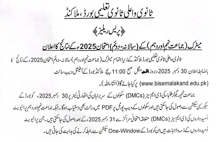 The students, who appeared in the exams, their result will be announced on 30-12-2025 in the premises of the education board. The DMCs of the 9th class regular students can be obtained from the Malakand Board office through the authority letter of the heads of the schools from 30-12-2025. The DMCs of the private students can be obtained from the exams centers of the private students after 31-12-2025. The private students, who have outstanding dues, they are instructed to report to one-window section of the board.